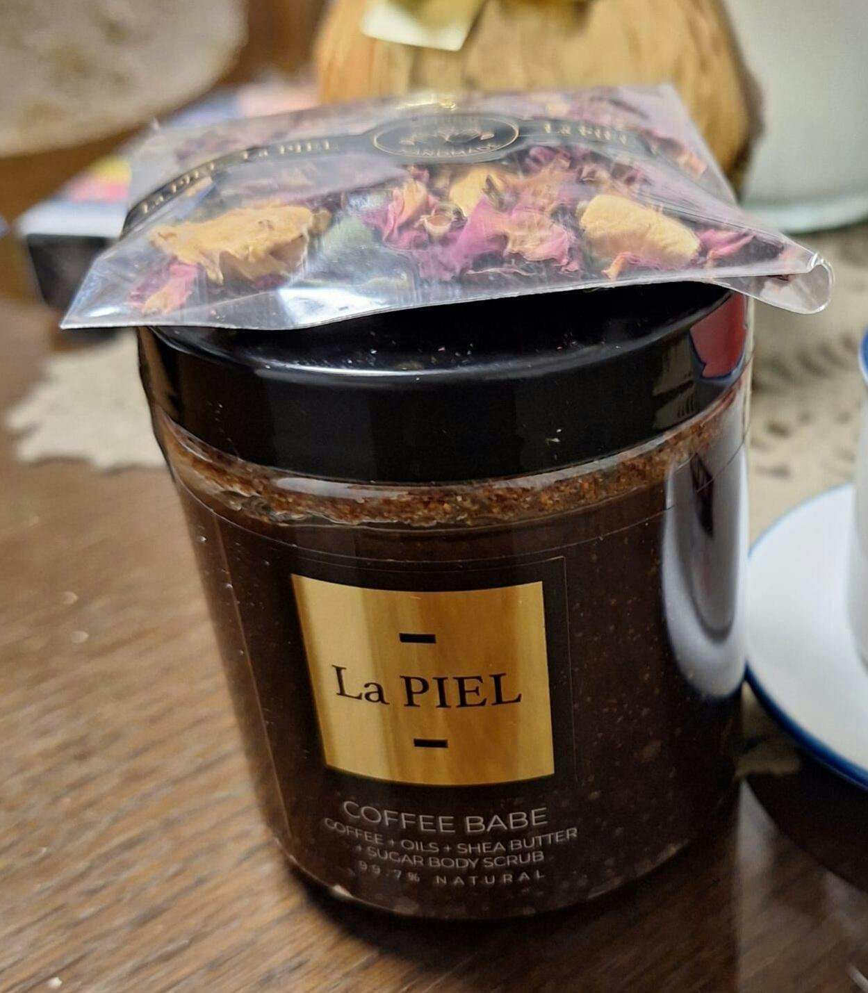 Piling za tijelo od kave nakon kojeg će Vaša koža biti mekana, nahranjena, glatka i mirišljava. Obnavlja njezin površinski sloj i time pomaže kod suhe kože i manjih nepravilnosti na koži (urasle dlačice, manje strije i manji ožiljci, strawberry legs). Regenerira, hrani i zaglađuje suhu i osjetljivu kožu tijela.